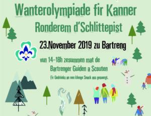 Dëse Samschdeg, 23. November, organiséiere mir eng Wanterolympiad fir Kanner. Maach och du mat a komm vu 14:00 bis 18:00 bei d’Schlittepist zu Bartreng. Fir Gedrénks an e klenge Snack ass gesuergt.